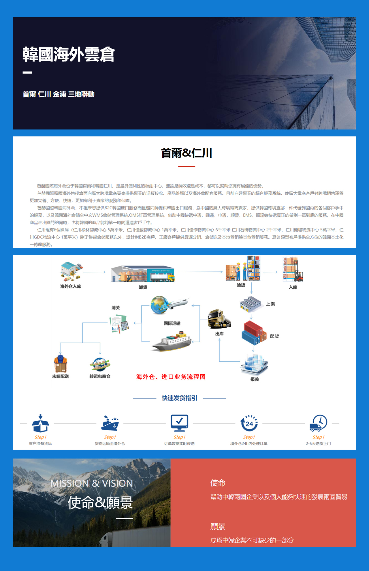 韩国芭赫国际BAHE INTERNATIONAL 成立于2017年1月16日 总部位于韩国,仓库位于仁川(仁川松林物流中心 5万平米,仁川佳载物流中心 1万平米,仁川佳作物流中心 6千平米 仁川石楠物流中心 2千平米,仁川机场物流中心 5万平米,仁川GDC物流中心 1万平米) ,我们一直以来致力于发展跨境电商进出口物流和全球电商仓储提供专业第三方物流服务。公司拥有多种跨境物流解决方案,丰富的干线运输渠道,与航空、船运公司签订合作协议, 为不同的客户群体寻找合适的方案提供专业有效的直邮服务。使用最先进的OMS订单管理系统以及WMS ,3PL仓储管理系统,致力于打造低运营成本,高效的智能化跨境电商物流直邮业务。