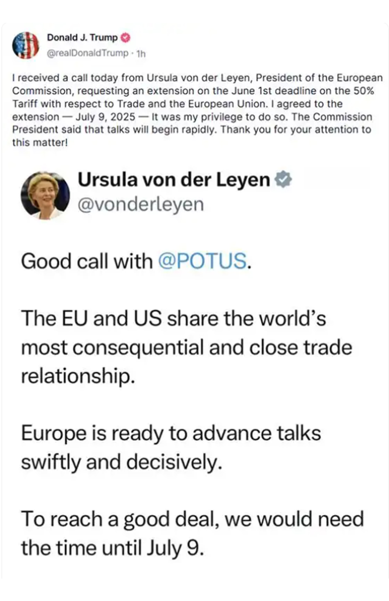 冯德莱恩当天稍早前在社交媒体X上发文说,她与特朗普有一次“好的通话”,但“要达成好的协议,我们需要时间,直至7月9日”。冯德莱恩表示,欧盟准备好“迅速且果断地”推进与美方的谈判。